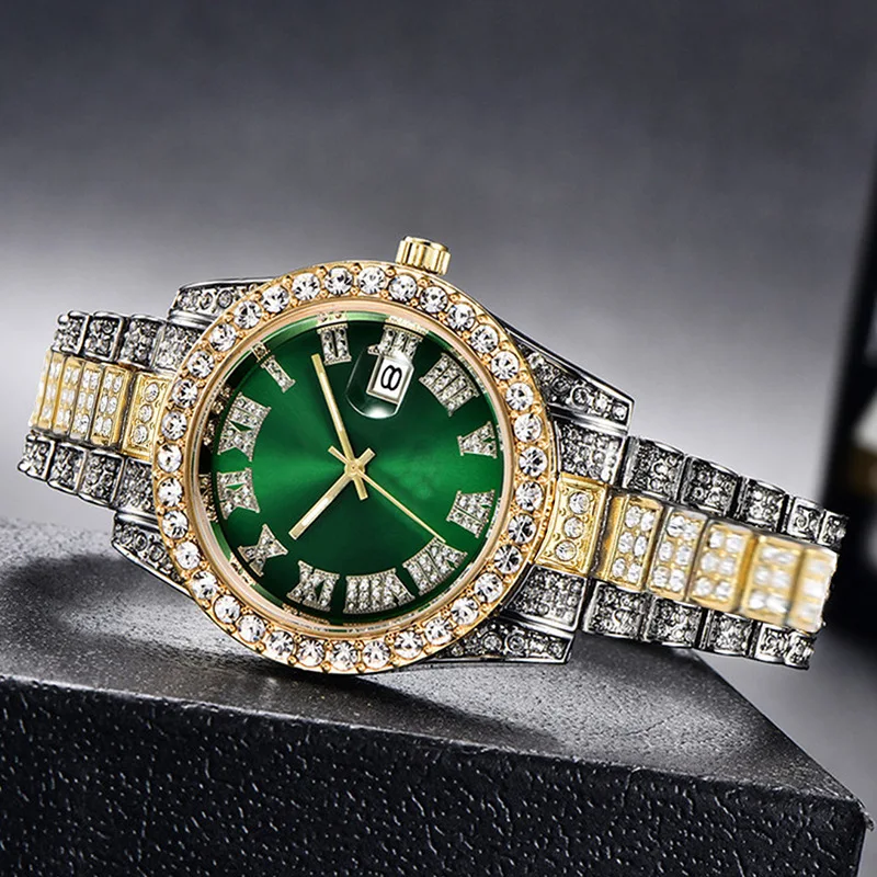Hot Sale Diamond Bling Watch Men Gold Color Luxury Gift Quartz Watches Male Clock Dropshipping Rhinestone Calendar Wristwatch